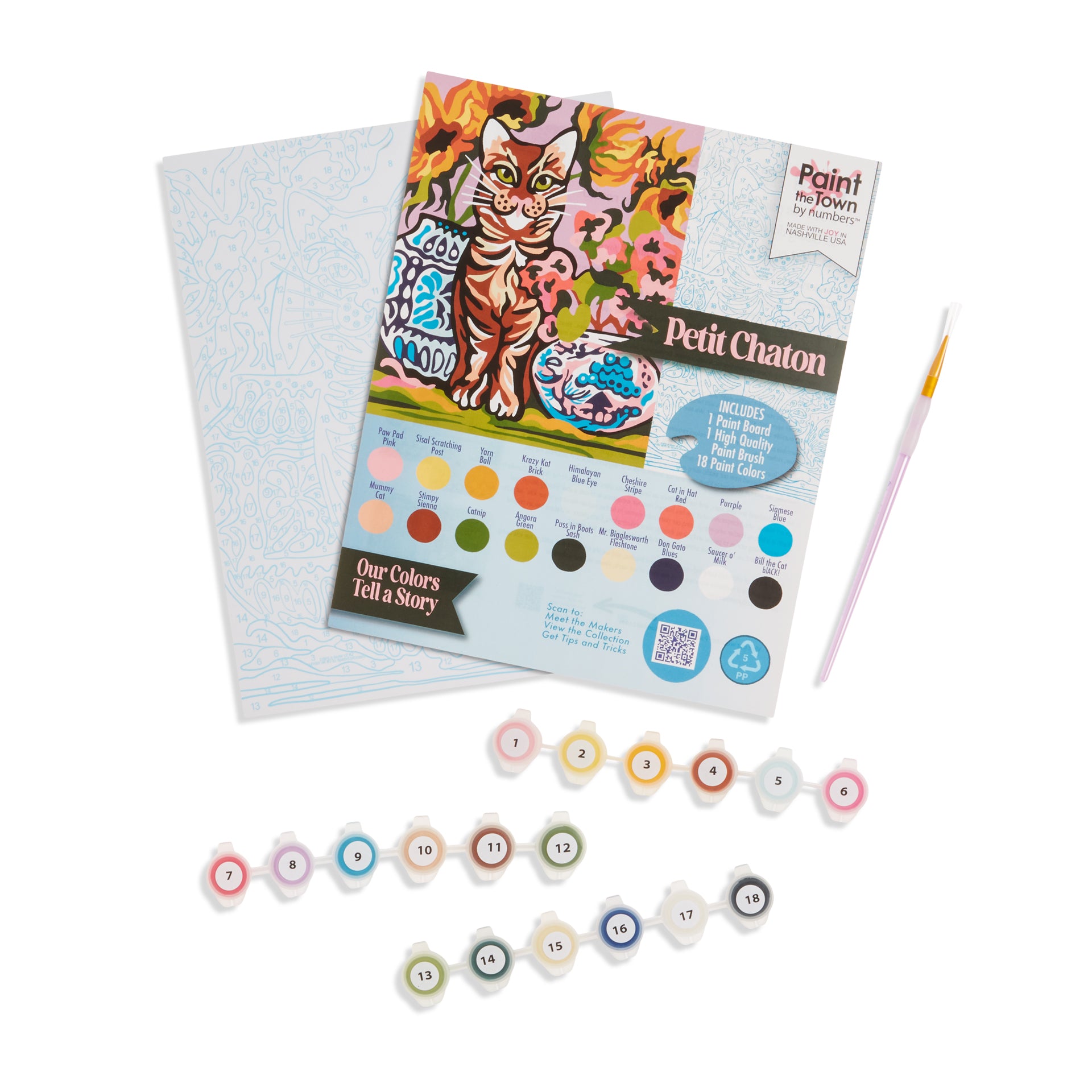 Our Petit Chaton (French for Little Kitten) paint by number kit is a still life depicting an orange kitten in repose; the cat is surrounded by blue and white chinoiserie vases and pots filled with sunflowers and orchids. It is an 8”x10” vintage style craft kit with blue numbers and lines on a 100% recycled heavy chipboard painting surface—NOT a rolled canvas. Designed and produced by Paint the Town by Numbers in Nashville, Tennessee; Made in USA.