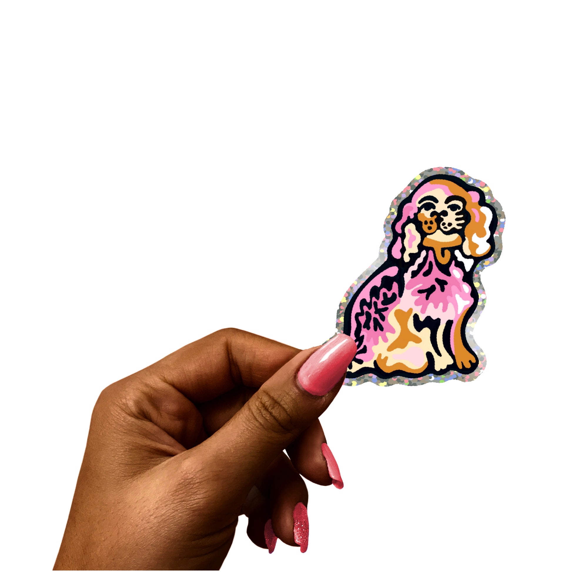 3”x2.3” holographic glitter sticker depicting our Staffordshire Dog design on a sturdy vinyl sticker; great for computers, helmets, drinking bottles—it’s dishwasher safe! Made in USA.