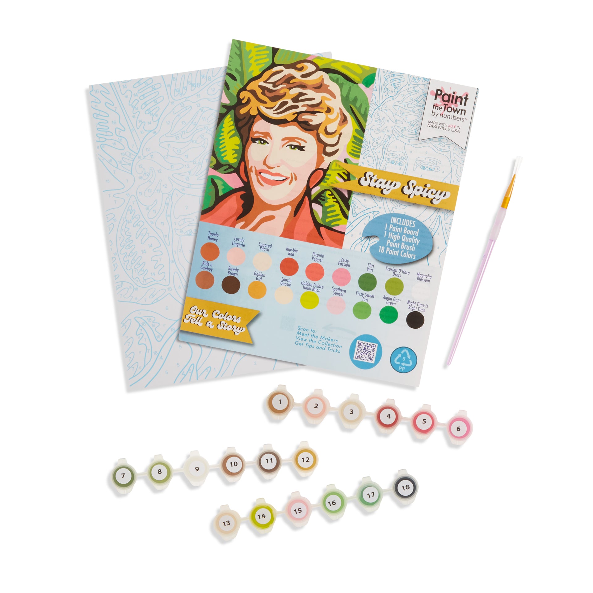 Our Stay Spicy paint by number kit features Blanche Devereaux sporting a particularly spicy look—as she so deserves! The color names add a fun touch; learn more about her personality through them. The design is an 8”x10” vintage style craft kit with blue numbers and lines on a 100% recycled heavy chipboard painting surface—NOT a rolled canvas. Designed and produced by Paint the Town by Numbers in Nashville, Tennessee; Made in USA.