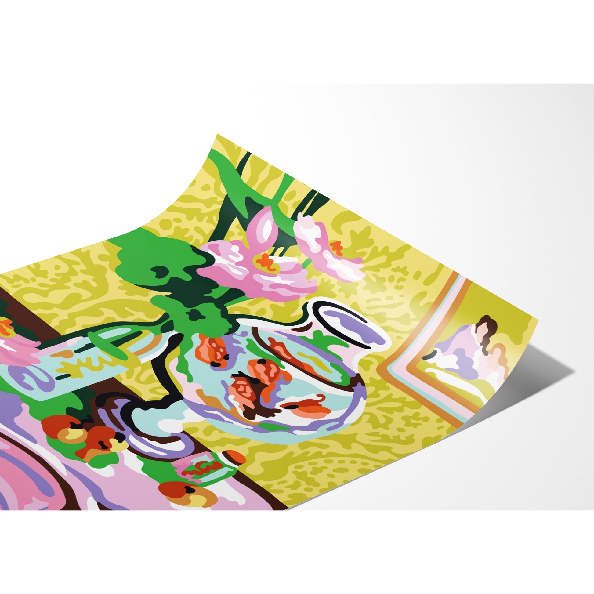8”x10” print of our Goldfish à la Matisse paint by number kit design. The print depicts an Henri Matisse inspired still life with Goldfish and bright colors. Each comes with protective sleeve and cardboard backing. Easily pops into any standard 8”x10” frame.