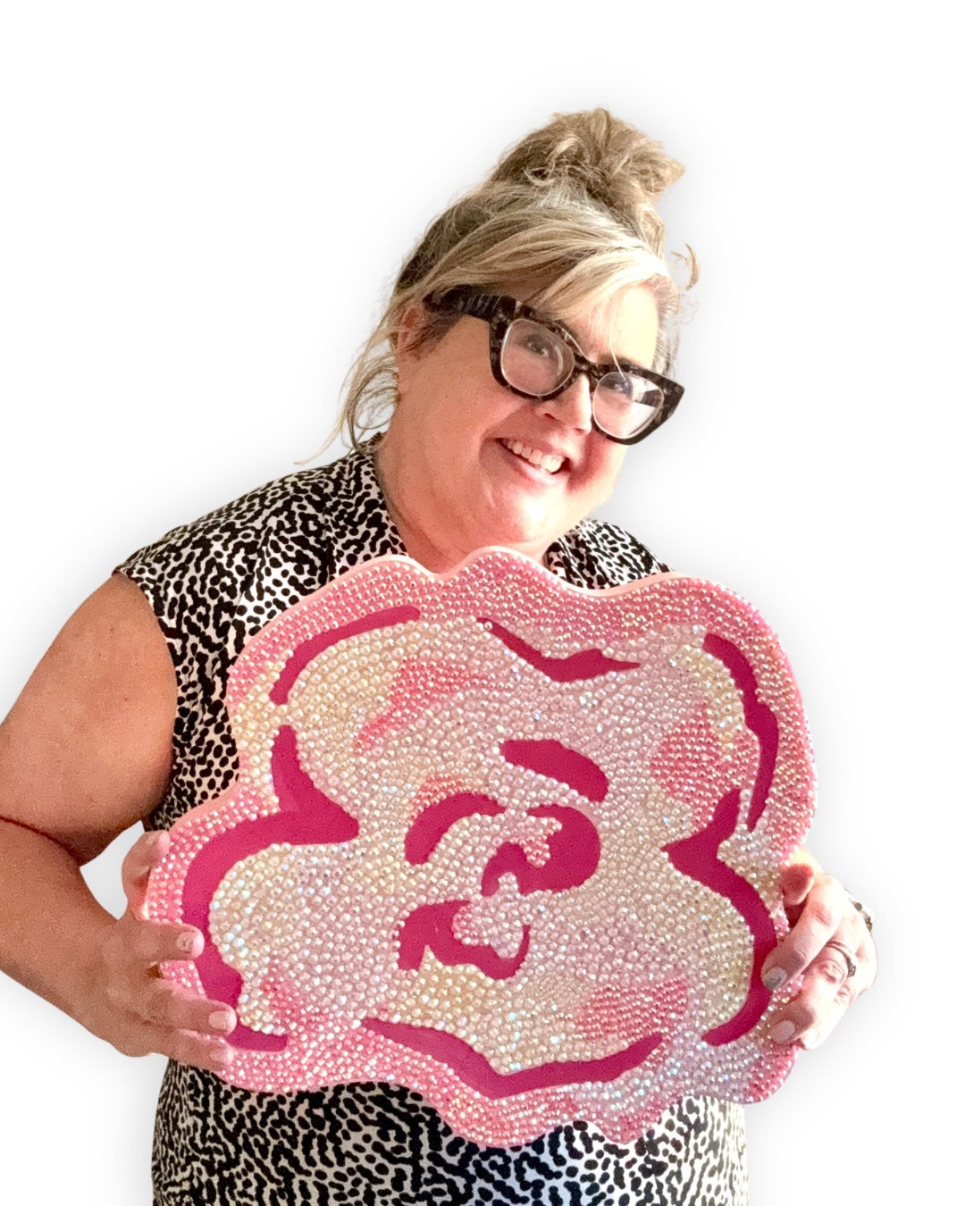 Shown held by the artist for scale, this larger rhinestone bloom makes a bold, joyful statement—perfect for gallery walls, entryways, offices, or any space that needs a hit of radiant, feminine energy. Luxe, playful, and unmistakably Camilla.