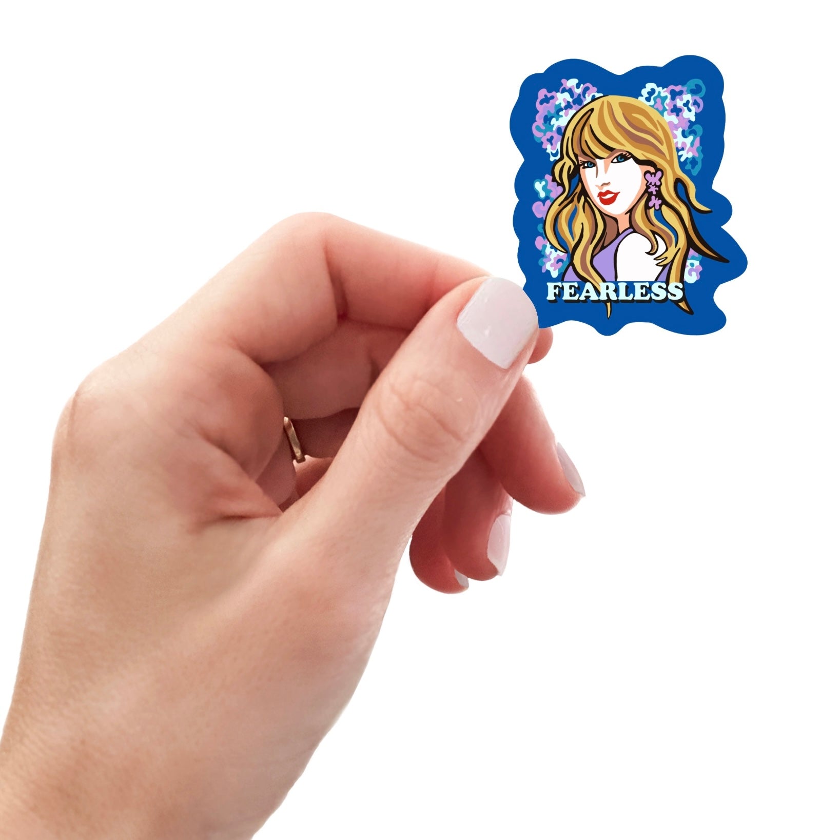 Sticker with Taylor Swift’s likeness with word ‘fearless’. 1.9”x2”. Dishwasher safe, vinyl, designed by Paint the Town by Numbers and made in USA