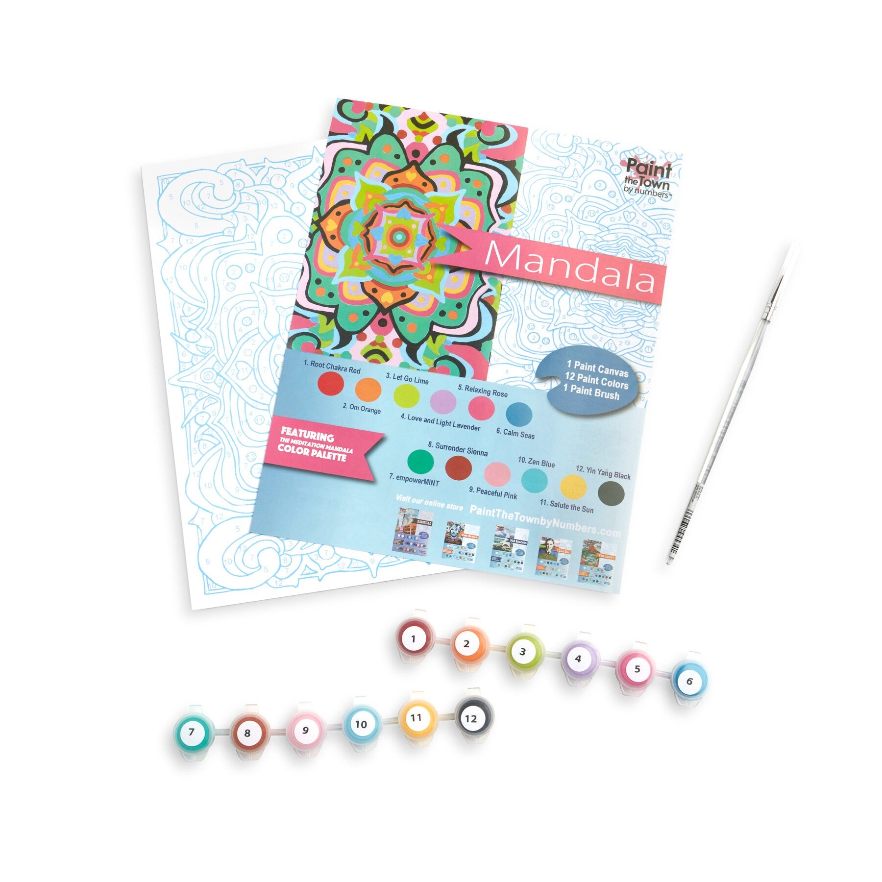 The Meditation Mandala kit features an original mandala design with color names that tell more about meditation, yoga, and other forms of self care. Each paint by numbers kit includes an 8”x10” painting board (same style as vintage American made paint by numbers kits with blue lines on heavy cardboard--NOT a canvas); 12 acrylic paint pots with high quality American-made craft acrylic paints that do not require any paint mixing; and a high quality detail-paint brush that will be usable after finishing this kit if it is taken care of. Our kits require nothing more than a glass of water, a paper towel, and a flat surface to begin enjoying. Our paint by number kits offer a warm nostalgic comfort that makes a great vintage inspired gift for any occasion, combining modern imagery with mid century vintage paint by number design styling. When finished, the paint board will pop into any 8"x10" frame, adding a cheerful splash of color to any home decor. Each Paint the Town by Numbers kit is designed by art teacher Camilla Spadafino, and each kit is created, produced, and shipped from our facility in Nashville, Tennessee. Our mission is to bring painting to as many people as possible. We see ourselves as a combination of Bob Ross, Mr. Rogers and Julia Childs rolled into one happy, fun paint by number experience. Our paint by number kits feature people and places that spark joy, and each kit features clever color names that reflect its theme and personality. Recommended for ages 5 and up. Paint by number kits are like working a puzzle. Our kit provides tips, but we encourage you to devise a strategy for working the painting. Then put on your favorite music or book on tape, and get ready to relax and unwind.