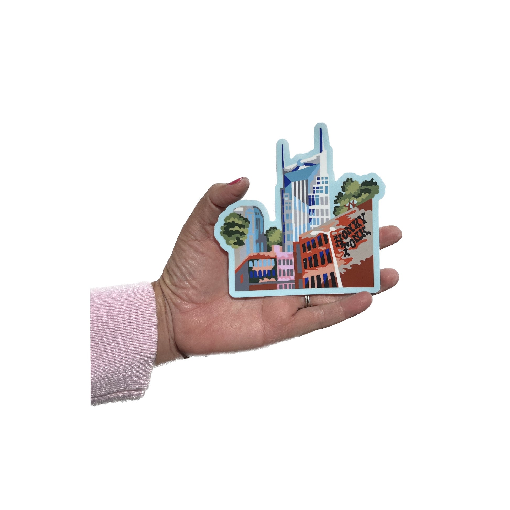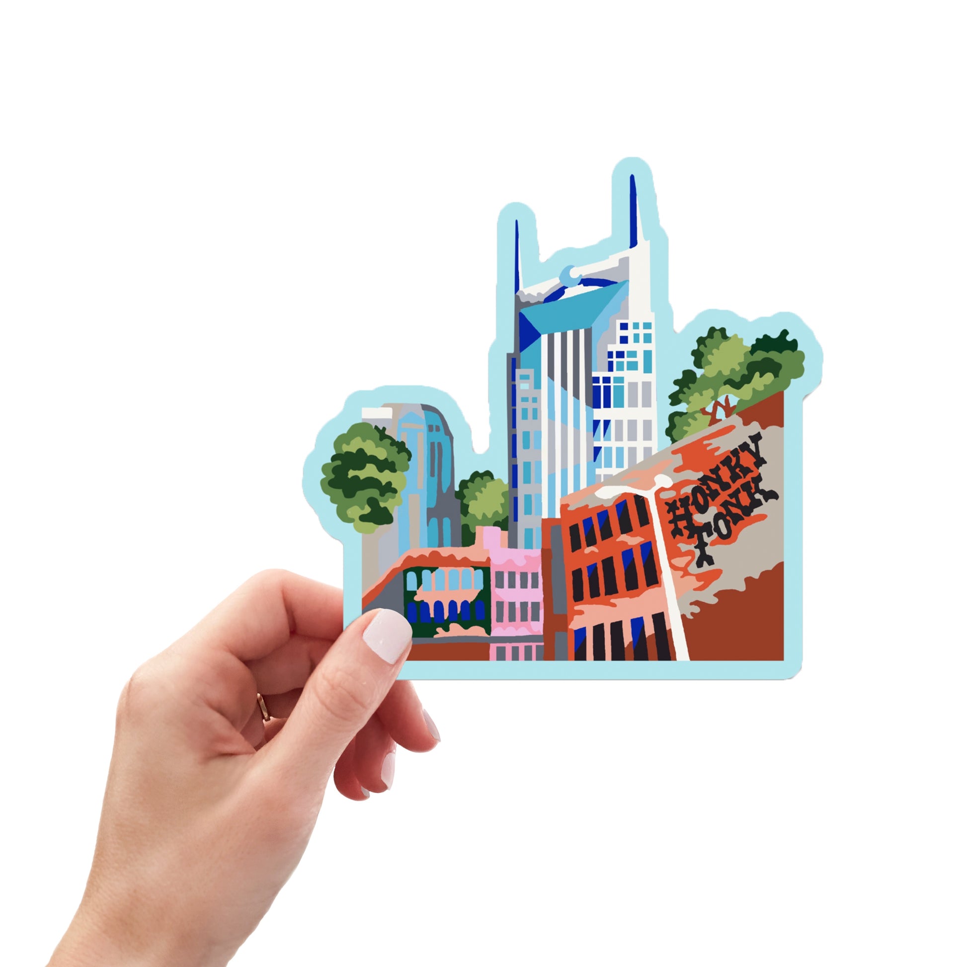 5”x5” large sturdy vinyl sticker depicting Nashville, Music City USA! Great for computers, helmets, drinking bottles—it’s dishwasher safe! Made in USA.