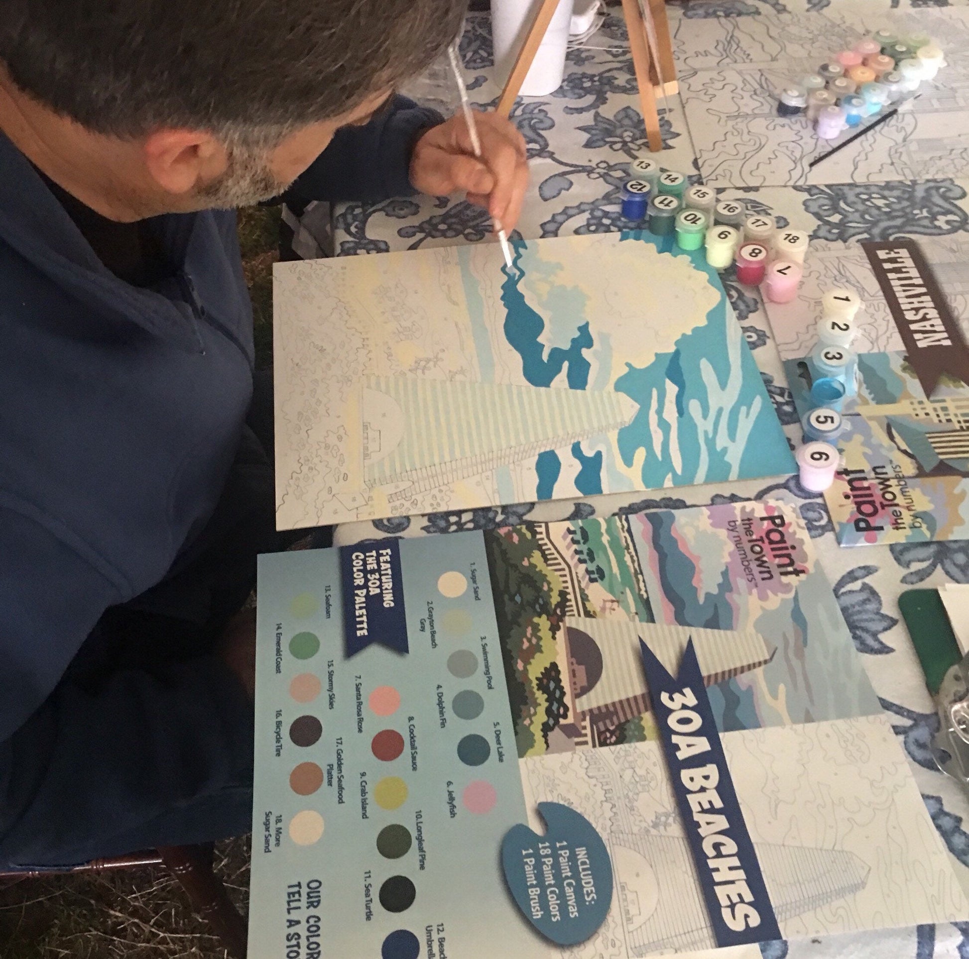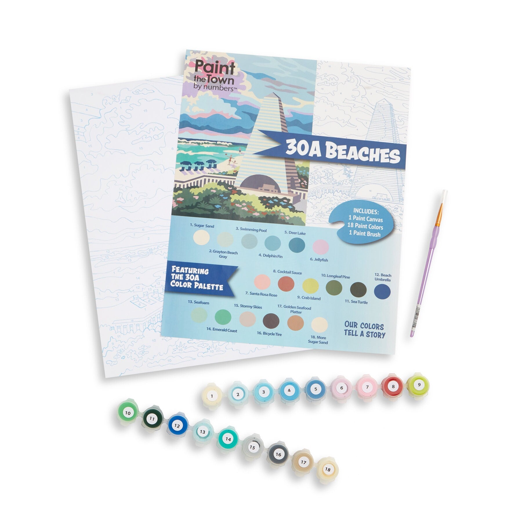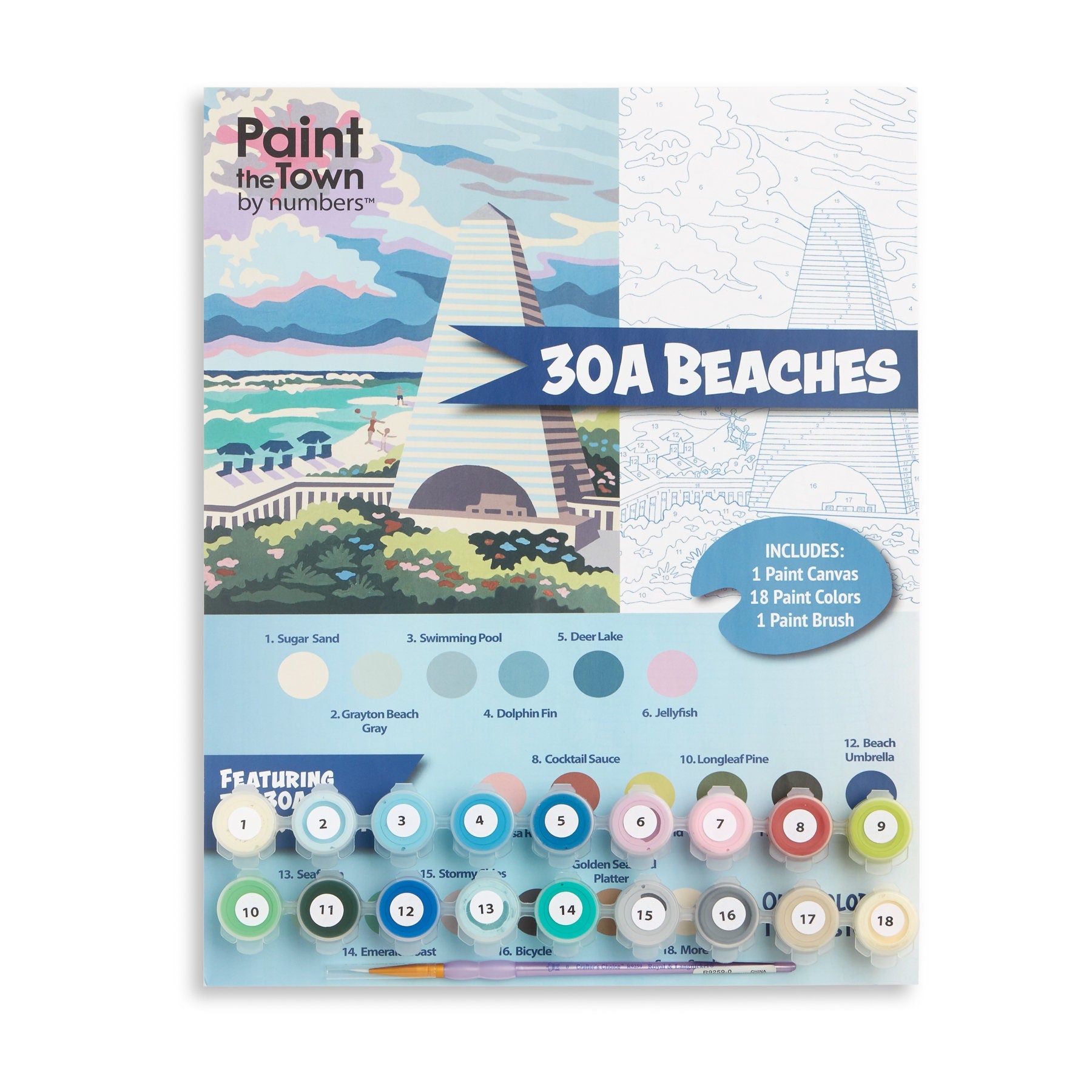 Our beach seascape paint by number depicts a pavilion as one sees along Highway 30a on the Florida Gulf Coast. It is an 11”x14” vintage style craft kit with blue numbers and lines on a 100% recycled heavy chipboard painting surface—NOT a rolled canvas. Designed and produced by Paint the Town by Numbers in Nashville, Tennessee; Made in USA. Titled 30a Beaches, this kit also contains 18 acrylic paint pots with high quality American-made craft acrylic paint and a high quality paint brush that will be usable after finishing this kit if it is cleaned properly. Our kits require nothing more than a cup of water, a paper towel, and a flat surface to begin enjoying—no canvas ironing or paint mixing required. Our paint by number kits offer a warm nostalgic comfort that makes a great vintage inspired gift for any occasion, combining modern imagery with mid century vintage paint by number design styling. When finished, the paint board will pop into any 11”x14” frame, adding a cheerful splash of color to any home decor. Each Paint the Town by Numbers kit is designed by art teacher Camilla Spadafino; each is drawn by hand, NOT a computer program. Our mission is to bring painting to as many people as possible. We see ourselves as a combination of Bob Ross, Mr. Rogers and Julia Childs rolled into one happy, fun paint by number experience. Our paint by number kits feature people and places that spark joy, and each kit features clever color names that reflect its theme and personality. Recommended for ages 5 and up. Paint by number kits are like working a puzzle—WITH PAINT! Our kit provides tips, and we encourage you to devise a strategy for working the painting. Then put on your favorite music or book on tape, and get ready to relax and unwind.