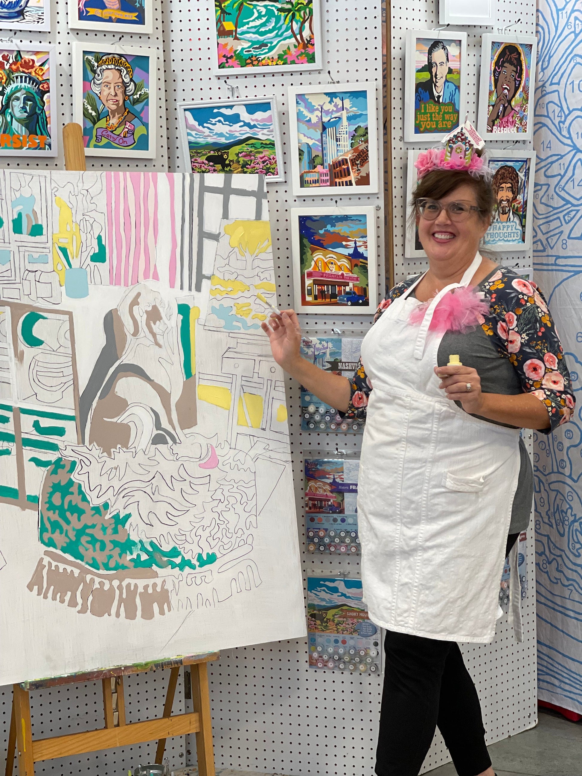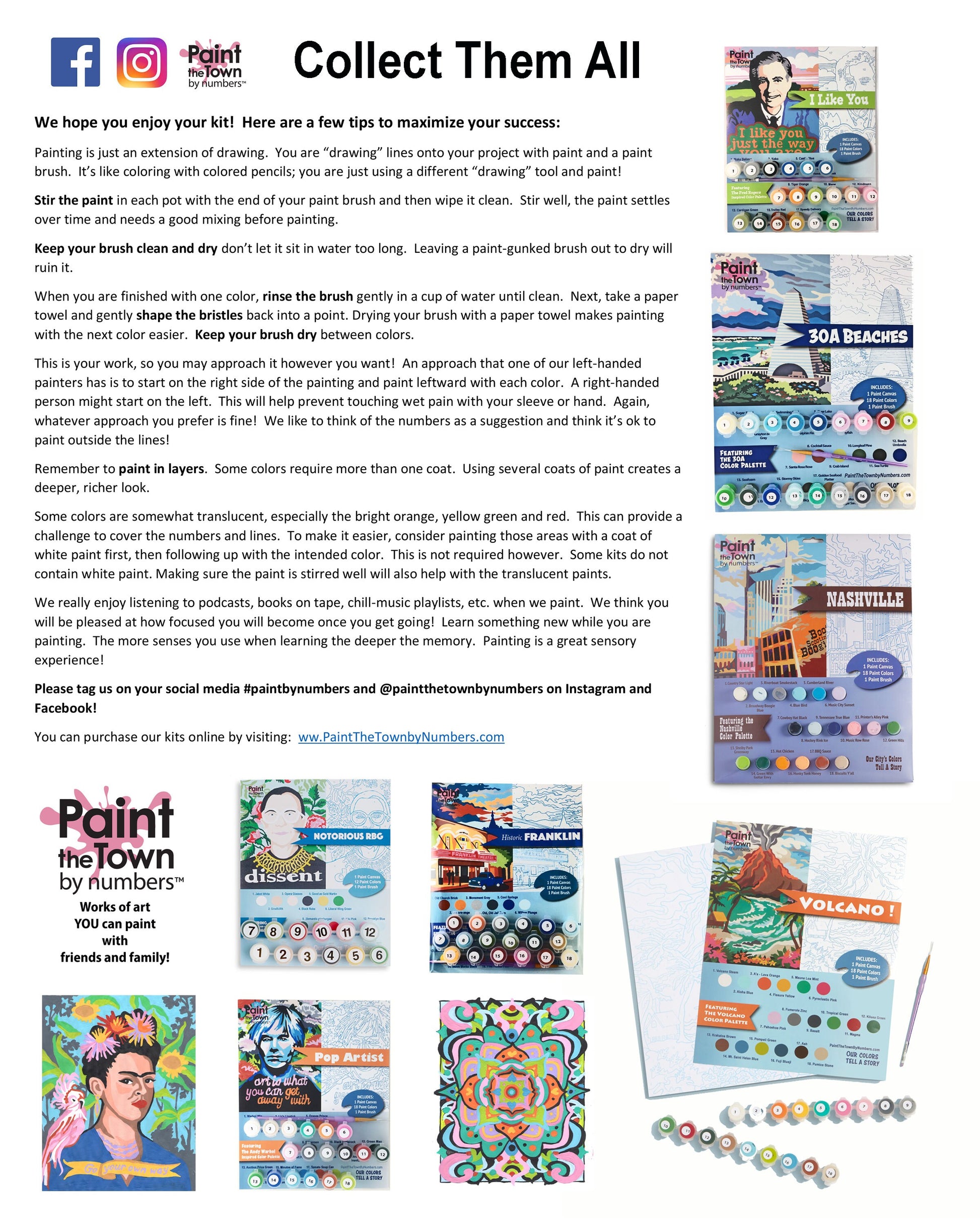 When finished, the paint board will pop into any 8"x10" frame, adding a cheerful splash of color to any home decor. Each Paint the Town by Numbers kit is designed by art teacher Camilla Spadafino; each is drawn by hand, NOT a computer program. Our mission is to bring painting to as many people as possible. We see ourselves as a combination of Bob Ross, Mr. Rogers and Julia Childs rolled into one happy, fun paint by number experience. Our paint by number kits feature people and places that spark joy, and each kit features clever color names that reflect its theme and personality. Recommended for ages 5 and up. Paint by number kits are like working a puzzle—WITH PAINT! Our kit provides tips, and we encourage you to devise a strategy for working the painting. Then put on your favorite music or book on tape, and get ready to relax and unwind.