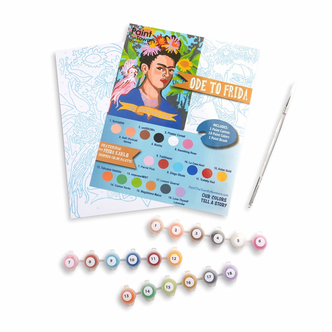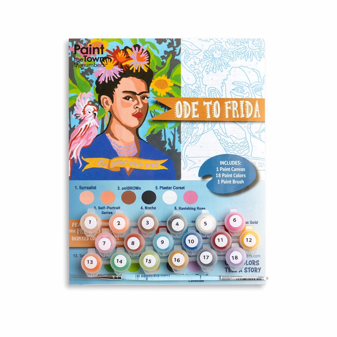 Our Frida Kahlo paint by number kit features a portrait of the Mexican folk art inspired artist. It is an 8”x10” vintage style craft kit with blue numbers and lines on a 100% recycled heavy chipboard painting surface—NOT a rolled canvas. Designed and produced by Paint the Town by Numbers in Nashville, Tennessee; Made in USA. Titled Ode to Frida, this kit also contains 18 acrylic paint pots with high quality American-made craft acrylic paint and a high quality paint brush that will be usable after finishing this kit if it is cleaned properly. Our kits require nothing more than a cup of water, a paper towel, and a flat surface to begin enjoying—no canvas ironing or paint mixing required. Our paint by number kits offer a warm nostalgic comfort that makes a great vintage inspired gift for any occasion, combining modern imagery with mid century vintage paint by number design styling. When finished, the paint board will pop into any 8"x10" frame, adding a cheerful splash of color to any home decor. Each Paint the Town by Numbers kit is designed by art teacher Camilla Spadafino; each is drawn by hand, NOT a computer program. Our mission is to bring painting to as many people as possible. We see ourselves as a combination of Bob Ross, Mr. Rogers and Julia Childs rolled into one happy, fun paint by number experience. Our paint by number kits feature people and places that spark joy, and each kit features clever color names that reflect its theme and personality. Recommended for ages 5 and up. Paint by number kits are like working a puzzle—WITH PAINT! Our kit provides tips, and we encourage you to devise a strategy for working the painting. Then put on your favorite music or book on tape, and get ready to relax and unwind.