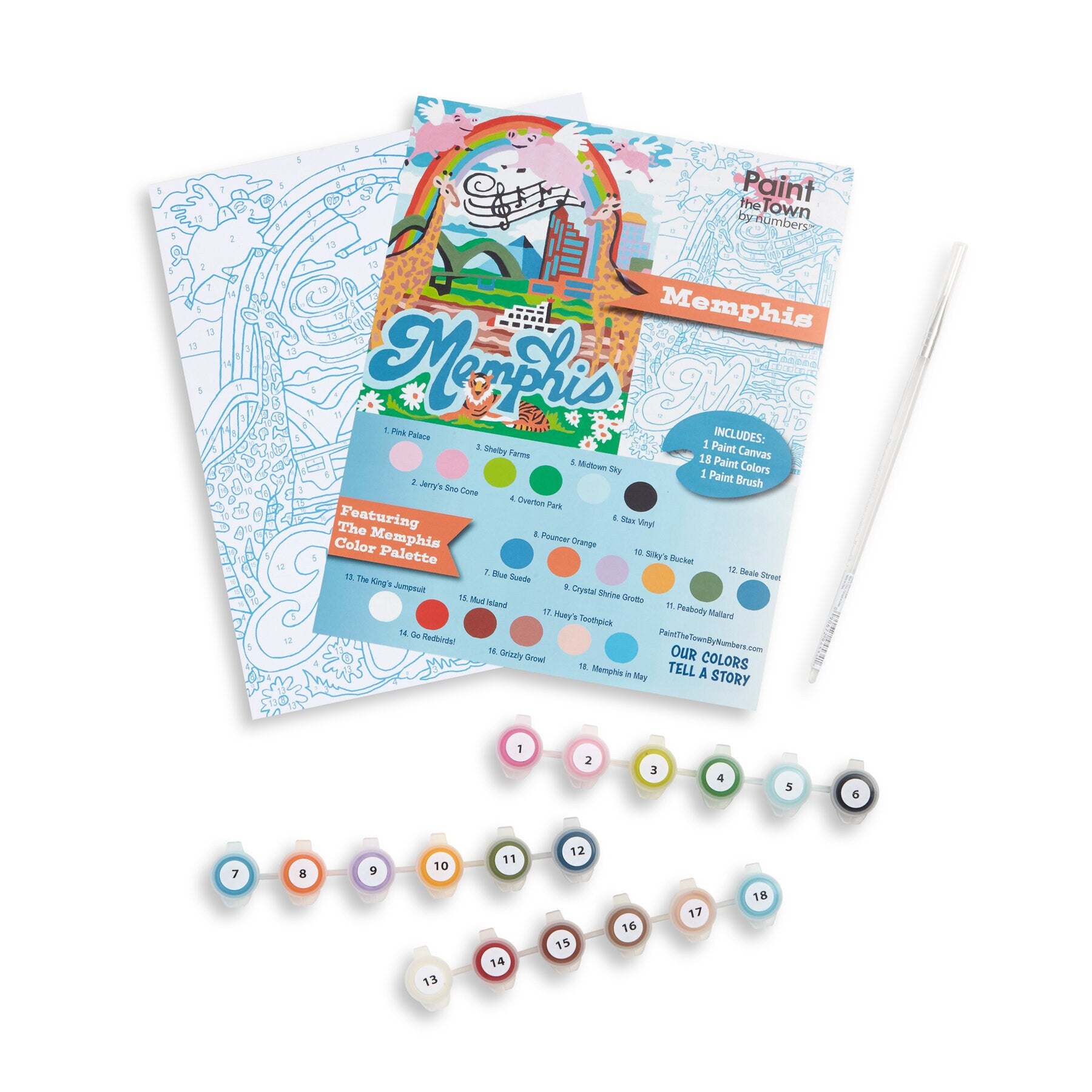 Our Memphis, Tennessee paint by number kit has references to the zoo, barbecue, Mississippi River, and the Tigers! It is an 8”x10” vintage style craft kit with blue numbers and lines on a 100% recycled heavy chipboard painting surface—NOT a rolled canvas. Designed and produced by Paint the Town by Numbers in Nashville, Tennessee; Made in USA. Titled Memphis, this kit also contains 18 acrylic paint pots with high quality American-made craft acrylic paint and a high quality paint brush that will be usable after finishing this kit if it is cleaned properly. Our kits require nothing more than a cup of water, a paper towel, and a flat surface to begin enjoying—no canvas ironing or paint mixing required. Our paint by number kits offer a warm nostalgic comfort that makes a great vintage inspired gift for any occasion, combining modern imagery with mid century vintage paint by number design styling. When finished, the paint board will pop into any 11”x14” frame, adding a cheerful splash of color to any home decor. Each Paint the Town by Numbers kit is designed by art teacher Camilla Spadafino; each is drawn by hand, NOT a computer program. Our mission is to bring painting to as many people as possible. We see ourselves as a combination of Bob Ross, Mr. Rogers and Julia Childs rolled into one happy, fun paint by number experience. Our paint by number kits feature people and places that spark joy, and each kit features clever color names that reflect its theme and personality. Recommended for ages 5 and up. Paint by number kits are like working a puzzle—WITH PAINT! Our kit provides tips, and we encourage you to devise a strategy for working the painting. Then put on your favorite music or book on tape, and get ready to relax and unwind.