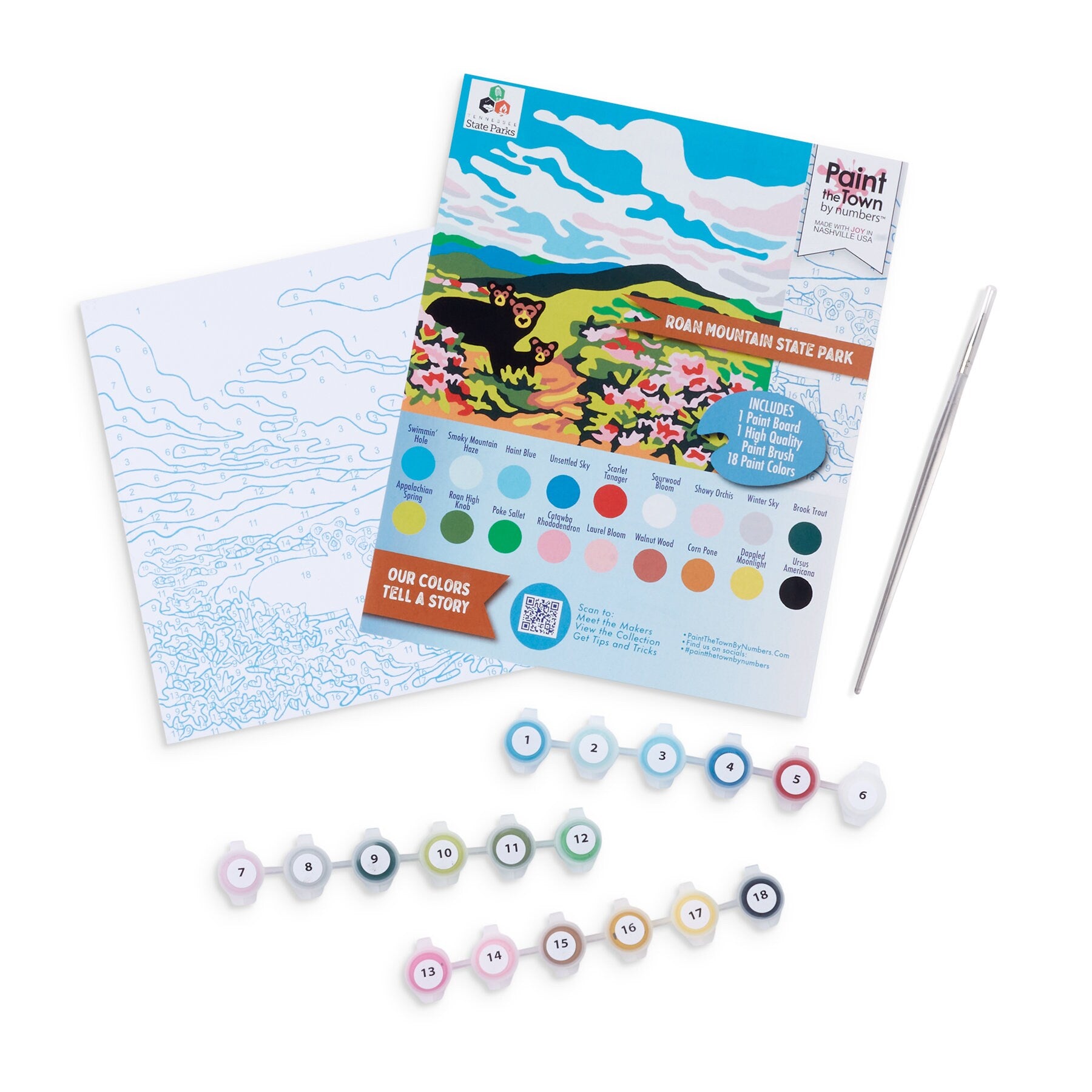 Our Smoky Mountains paint by number kit is an Appalachian mountain landscape with black bear family. It is an 8”x10” vintage style craft kit with blue numbers and lines on a 100% recycled heavy chipboard painting surface—NOT a rolled canvas. Designed and produced by Paint the Town by Numbers in Nashville, Tennessee; Made in USA. Titled Smoky Mountains, this kit also contains 18 acrylic paint pots with high quality American-made craft acrylic paint and a high quality paint brush that will be usable after finishing this kit if it is cleaned properly. Our kits require nothing more than a cup of water, a paper towel, and a flat surface to begin enjoying—no canvas ironing or paint mixing required. Our paint by number kits offer a warm nostalgic comfort that makes a great vintage inspired gift for any occasion, combining modern imagery with mid century vintage paint by number design styling. When finished, the paint board will pop into any 8"x10" frame, adding a cheerful splash of color to any home decor. Each Paint the Town by Numbers kit is designed by art teacher Camilla Spadafino; each is drawn by hand, NOT a computer program. Our mission is to bring painting to as many people as possible. We see ourselves as a combination of Bob Ross, Mr. Rogers and Julia Childs rolled into one happy, fun paint by number experience. Our paint by number kits feature people and places that spark joy, and each kit features clever color names that reflect its theme and personality. Recommended for ages 5 and up. Paint by number kits are like working a puzzle—WITH PAINT! Our kit provides tips, and we encourage you to devise a strategy for working the painting. Then put on your favorite music or book on tape, and get ready to relax and unwind.