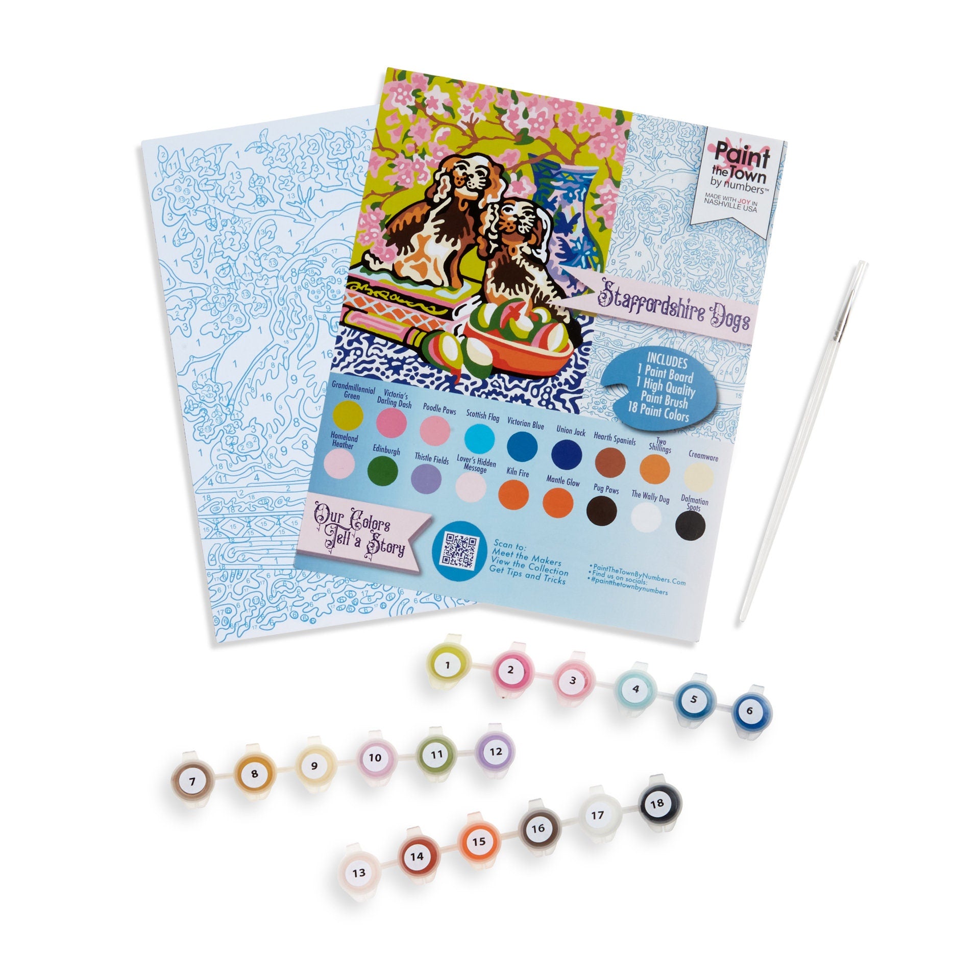 Our Staffordshire Dogs paint by number kit is a still life with blue and white vase and Cherry blossoms. Scotland seems to be the origin of these fun pottery pieces, but they are cherished throughout Britain, Europe, and the US. It is an 8”x10” vintage style craft kit with blue numbers and lines on a 100% recycled heavy chipboard painting surface—NOT a rolled canvas. Designed and produced by Paint the Town by Numbers in Nashville, Tennessee; Made in USA. Titled Staffordshire Dogs, this kit also contains 18 acrylic paint pots with high quality American-made craft acrylic paint and a high quality paint brush that will be usable after finishing this kit if it is cleaned properly. Our kits require nothing more than a cup of water, a paper towel, and a flat surface to begin enjoying—no canvas ironing or paint mixing required. Our paint by number kits offer a warm nostalgic comfort that makes a great vintage inspired gift for any occasion, combining modern imagery with mid century vintage paint by number design styling. When finished, the paint board will pop into any 8"x10" frame, adding a cheerful splash of color to any home decor. Each Paint the Town by Numbers kit is designed by art teacher Camilla Spadafino; each is drawn by hand, NOT a computer program. Our mission is to bring painting to as many people as possible. We see ourselves as a combination of Bob Ross, Mr. Rogers and Julia Childs rolled into one happy, fun paint by number experience. Our paint by number kits feature people and places that spark joy, and each kit features clever color names that reflect its theme and personality. Recommended for ages 5 and up. Paint by number kits are like working a puzzle—WITH PAINT! Our kit provides tips, and we encourage you to devise a strategy for working the painting. Then put on your favorite music or book on tape, and get ready to relax and unwind. Our paint by number kits offer a warm nostalgic comfort that makes a great vintage inspired gift for any occasion, combining modern imagery with mid century vintage paint by number design styling. When finished, the paint board will pop into any 8"x10" frame, adding a cheerful splash of color to any home decor. Each Paint the Town by Numbers kit is designed by art teacher Camilla Spadafino; each is drawn by hand, NOT a computer program. Our mission is to bring painting to as many people as possible. We see ourselves as a combination of Bob Ross, Mr. Rogers and Julia Childs rolled into one happy, fun paint by number experience. Our paint by number kits feature people and places that spark joy, and each kit features clever color names that reflect its theme and personality. Recommended for ages 5 and up. Paint by number kits are like working a puzzle—WITH PAINT! Our kit provides tips, and we encourage you to devise a strategy for working the painting. Then put on your favorite music or book on tape, and get ready to relax and unwind.