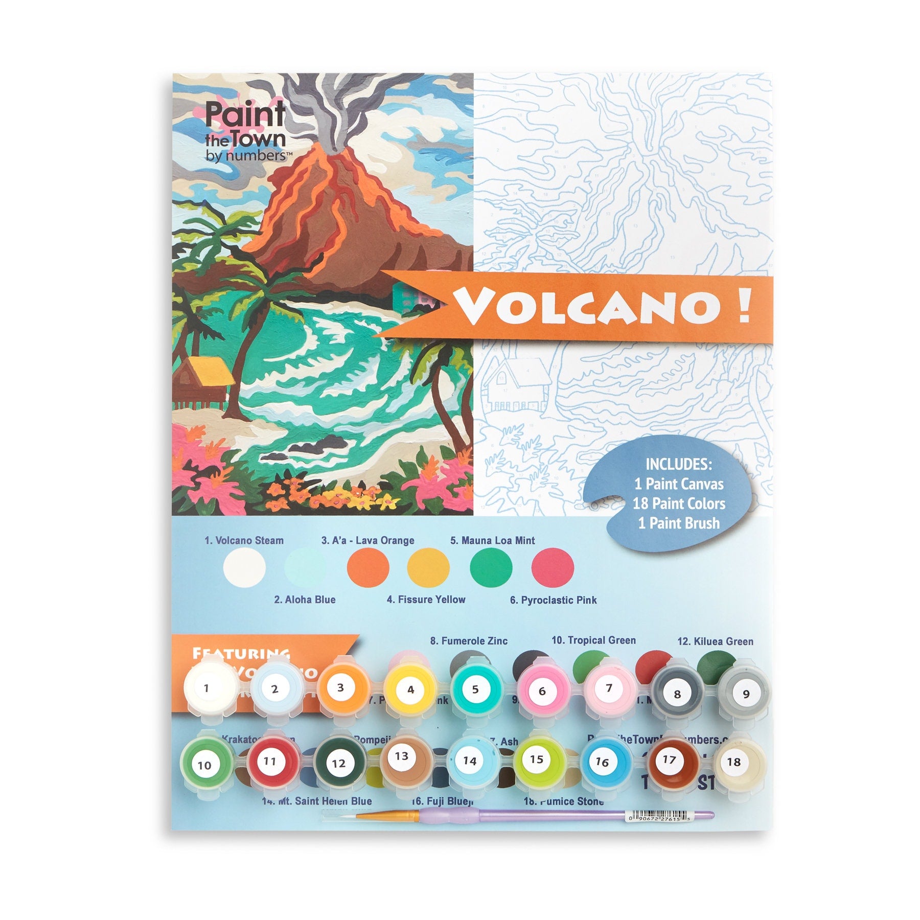 Our volcano paint by number depicts a ring of fire city, perhaps Honolulu, Hawaii! In mid century tiki style, it is an 11”x14” vintage style craft kit with blue numbers and lines on a 100% recycled heavy chipboard painting surface—NOT a rolled canvas. Designed and produced by Paint the Town by Numbers in Nashville, Tennessee; Made in USA. Titled Volcano, this kit also contains 18 acrylic paint pots with high quality American-made craft acrylic paint and a high quality paint brush that will be usable after finishing this kit if it is cleaned properly. Our kits require nothing more than a cup of water, a paper towel, and a flat surface to begin enjoying—no canvas ironing or paint mixing required. Our paint by number kits offer a warm nostalgic comfort that makes a great vintage inspired gift for any occasion, combining modern imagery with mid century vintage paint by number design styling. When finished, the paint board will pop into any 11”x14” frame, adding a cheerful splash of color to any home decor. Each Paint the Town by Numbers kit is designed by art teacher Camilla Spadafino; each is drawn by hand, NOT a computer program. Our mission is to bring painting to as many people as possible. We see ourselves as a combination of Bob Ross, Mr. Rogers and Julia Childs rolled into one happy, fun paint by number experience. Our paint by number kits feature people and places that spark joy, and each kit features clever color names that reflect its theme and personality. Recommended for ages 5 and up. Paint by number kits are like working a puzzle—WITH PAINT! Our kit provides tips, and we encourage you to devise a strategy for working the painting. Then put on your favorite music or book on tape, and get ready to relax and unwind.