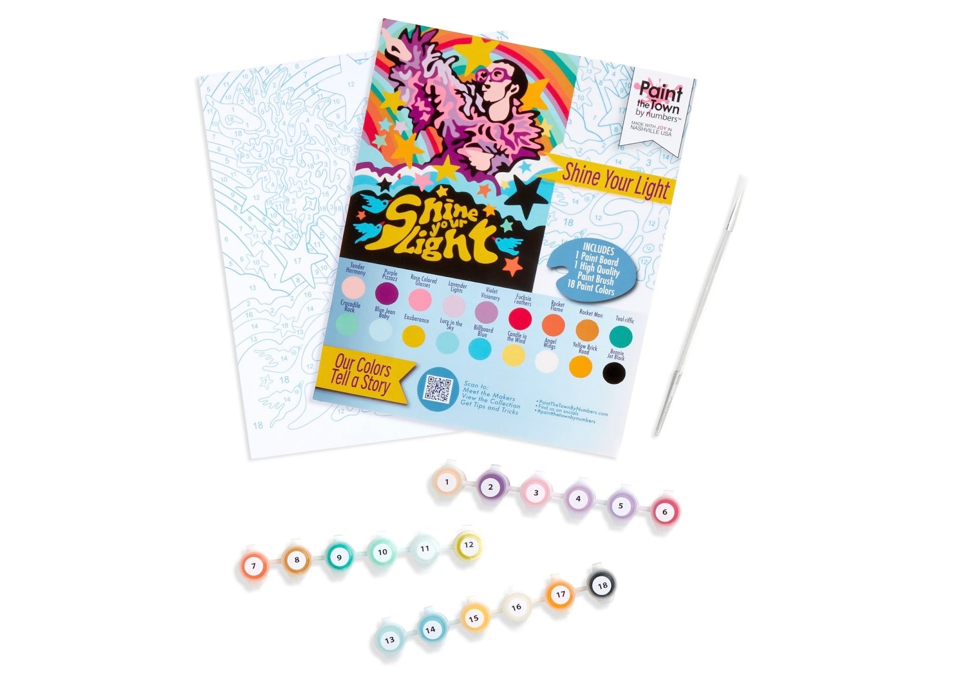 Our Shine Your Light paint by number kit is a rollicking scene of a musician Shining His Light and bringing others along! It is an 8”x10” vintage style craft kit with blue numbers and lines on a 100% recycled heavy chipboard painting surface—NOT a rolled canvas. Designed and produced by Paint the Town by Numbers in Nashville, Tennessee; Made in USA.